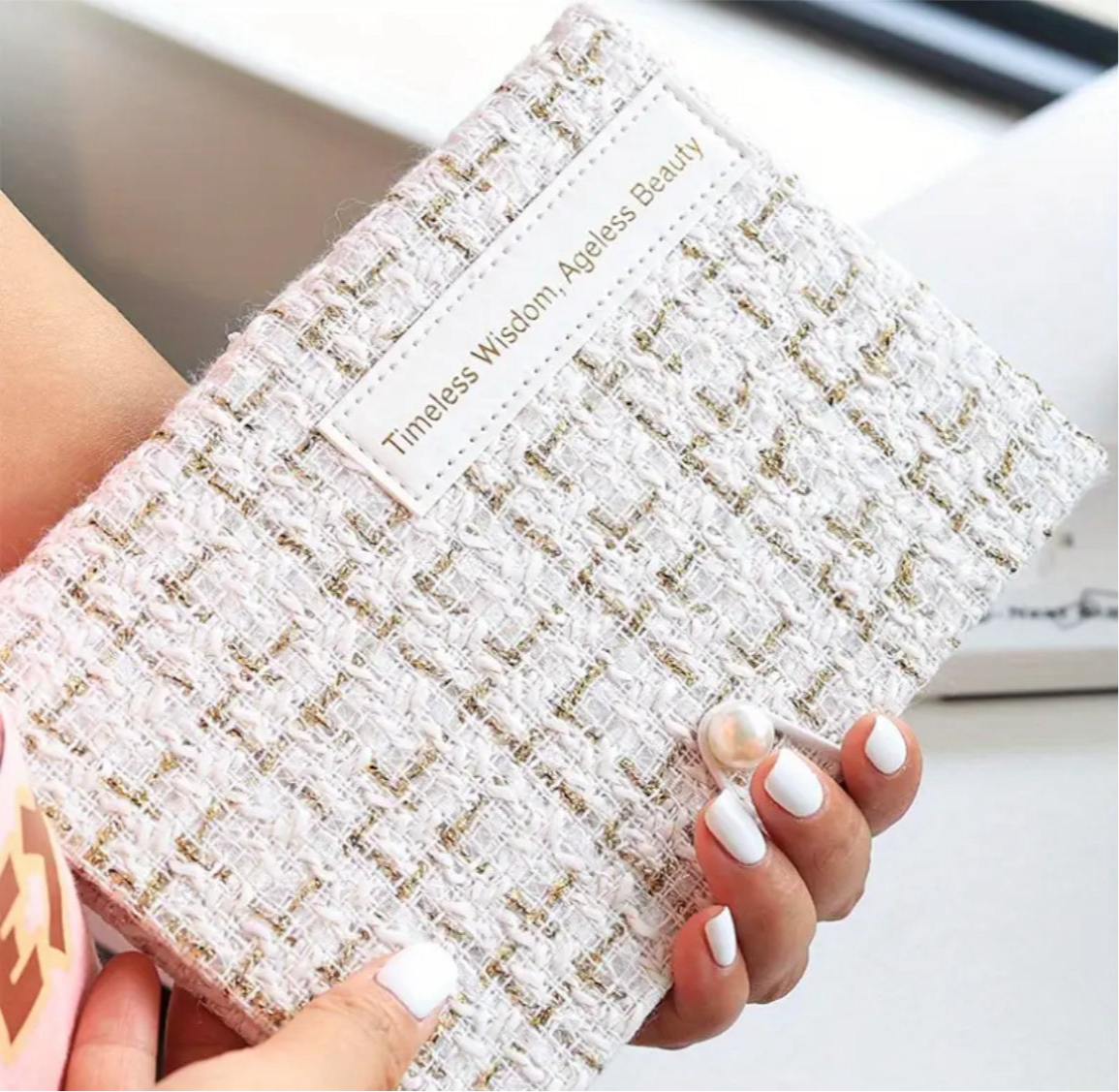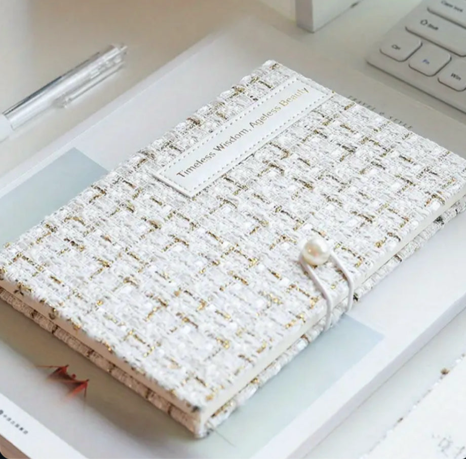 Laissez-vous séduire par ce bloc-notes unique, pensé pour allier raffinement et praticité. Avec sa couverture tissée façon tweed blanc et doré, sublimée d’un délicat bouton perle, il incarne l’élégance intemporelle.